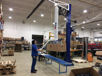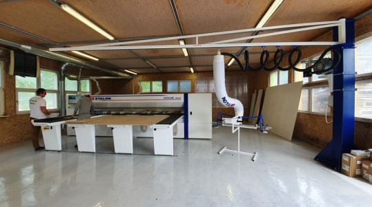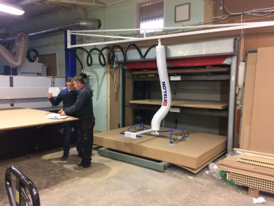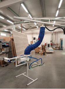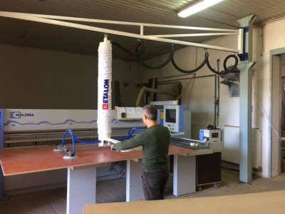Using human force for material handling can result in significant additional costs. This is because, due to the size and weight of the furniture board, two people are required for the operation. In order to make one person sufficient for operating the cutting machine or CNC milling machine, it is advisable to install a vacuum lifter next to the machine. The vacuum tube lifter is a safe and cost-effective way to handle materials, and its major advantage is that both lifting and gripping are performed by a high-performance vacuum pump placed on the column. As a result, lifting is fast and infinitely adjustable, and the range of materials that can be handled with the device is wide.